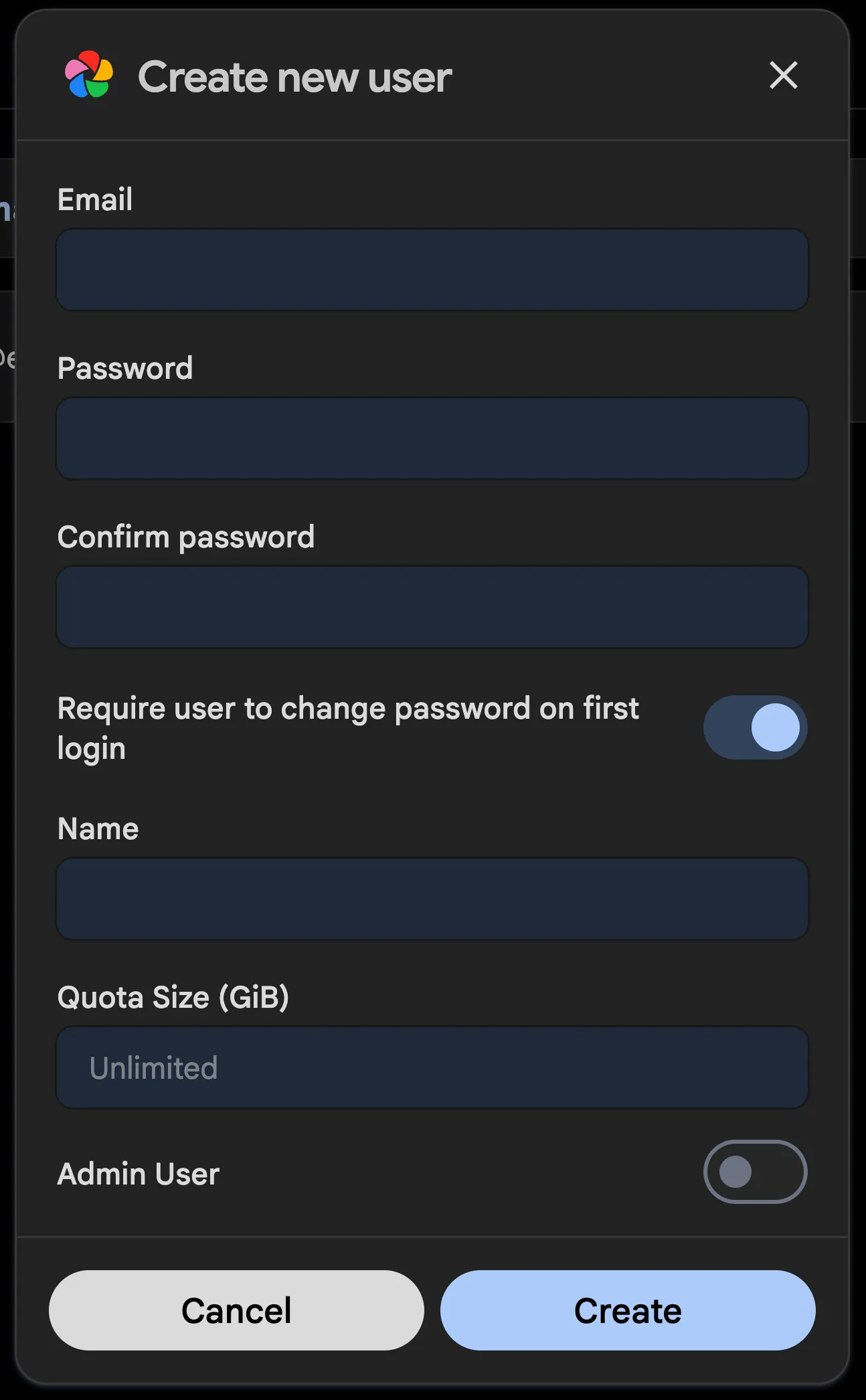 On the Administration > Users page, you can click on the Create user button, and you'll be presented with the following dialog: